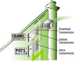 A. Over the Wire: At the other end of the phone line--18,000 feet away at most--is another ADSL modem, located at the phone company's central office. This modem also has a POTS splitter, which separates the voice calls from the data.