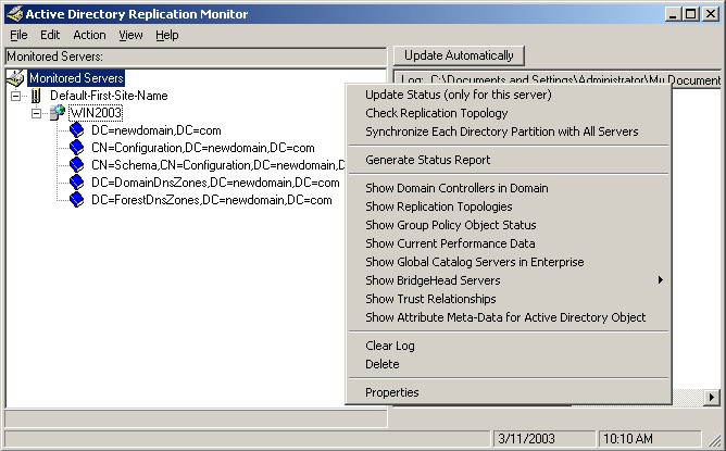 Use REPLMON to query and control replication and to view the location of the FSMO roles as shown in the following dialogs.